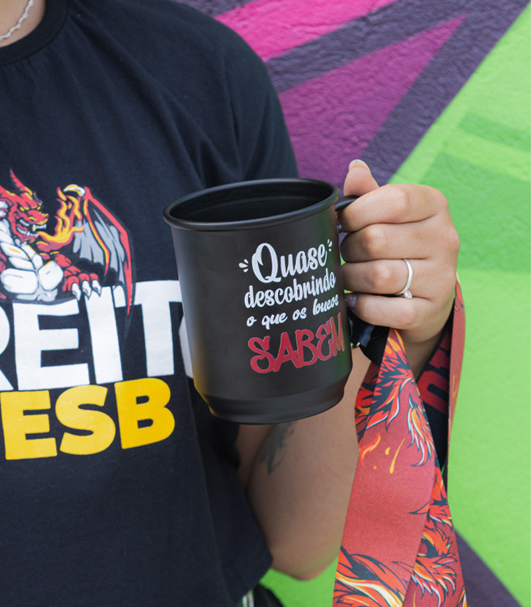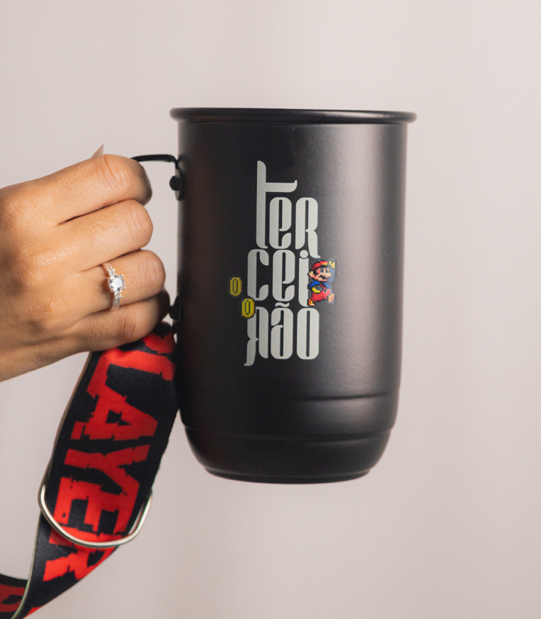 Nossas canecas são feitas de 100% alumínio, com tirante incluso.